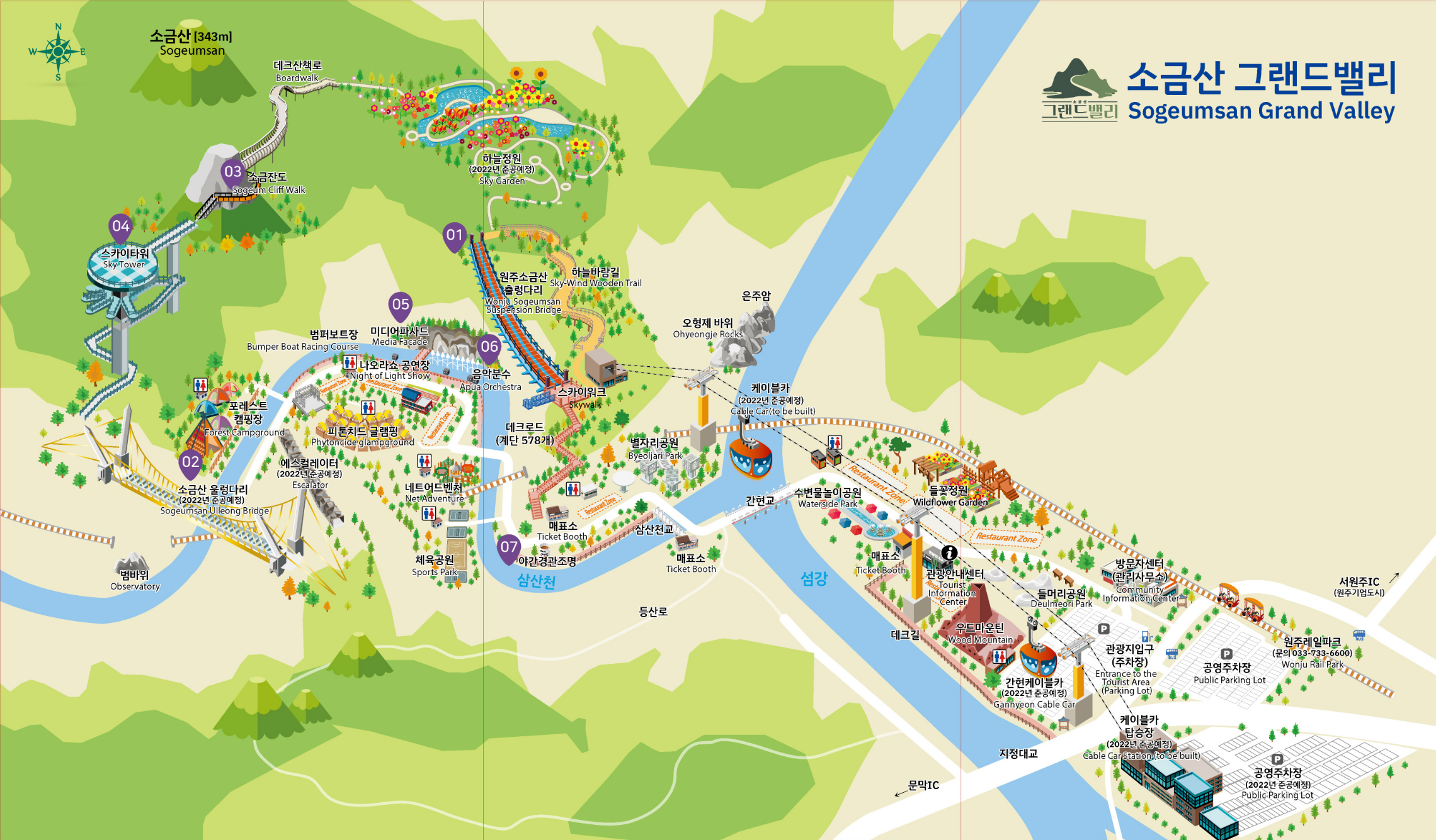 소금산 그랜드 밸리에는 다양한 것들이 많이 있습니다. 아래 안내도를 살펴 보시면 구경할 거리가 참 많다는 것을 알 수 있죠. 거리는 조금 되니 많이 걸을 준비는 해야 합니다.