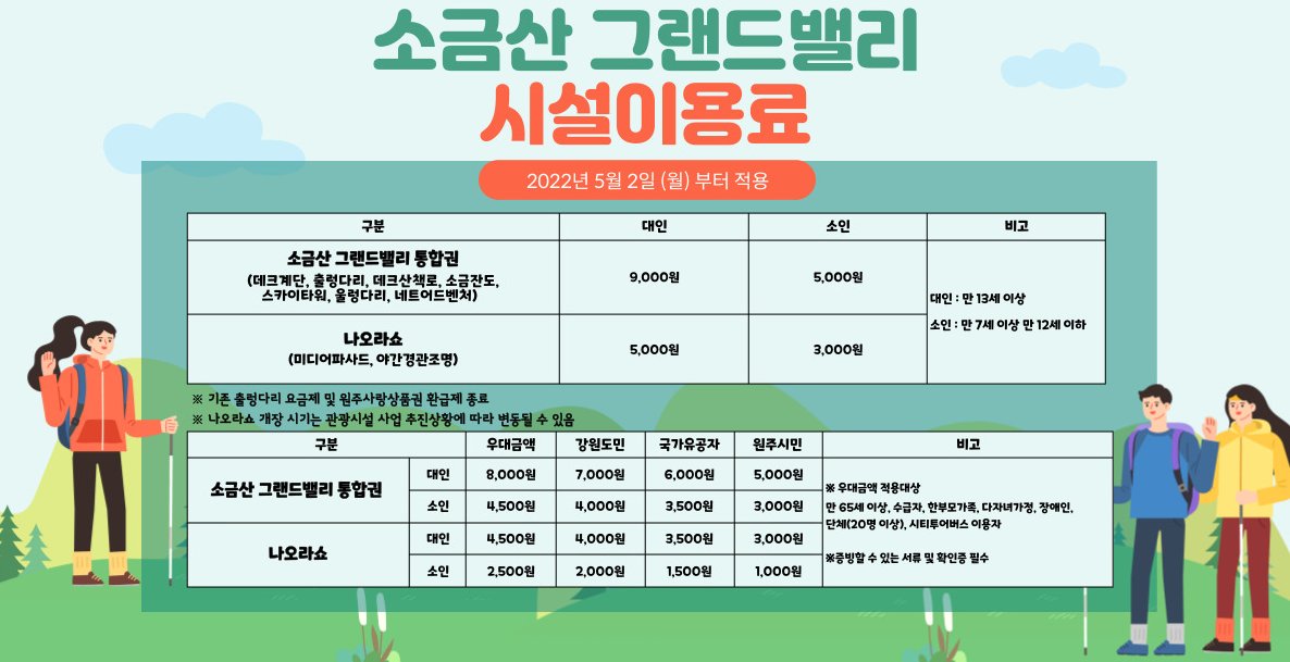 소금산 그랜드밸리의 요금은 2022년 5월 2일부터 아래 요금으로 인상됩니다. 기존 요금은 3천원이었지만, 대폭 인상되었습니다.